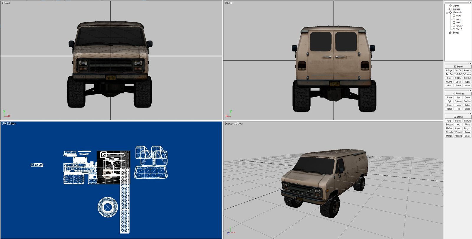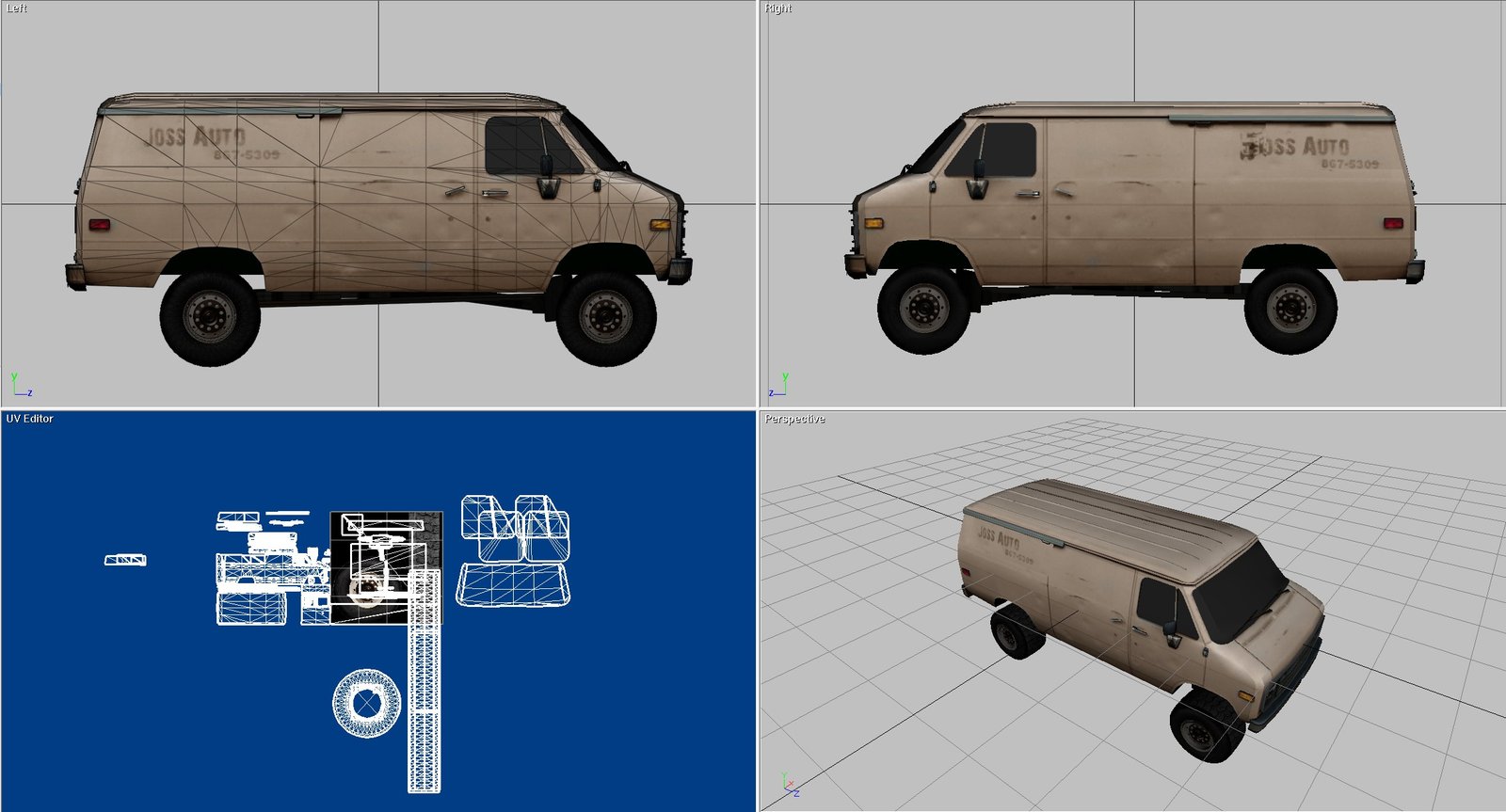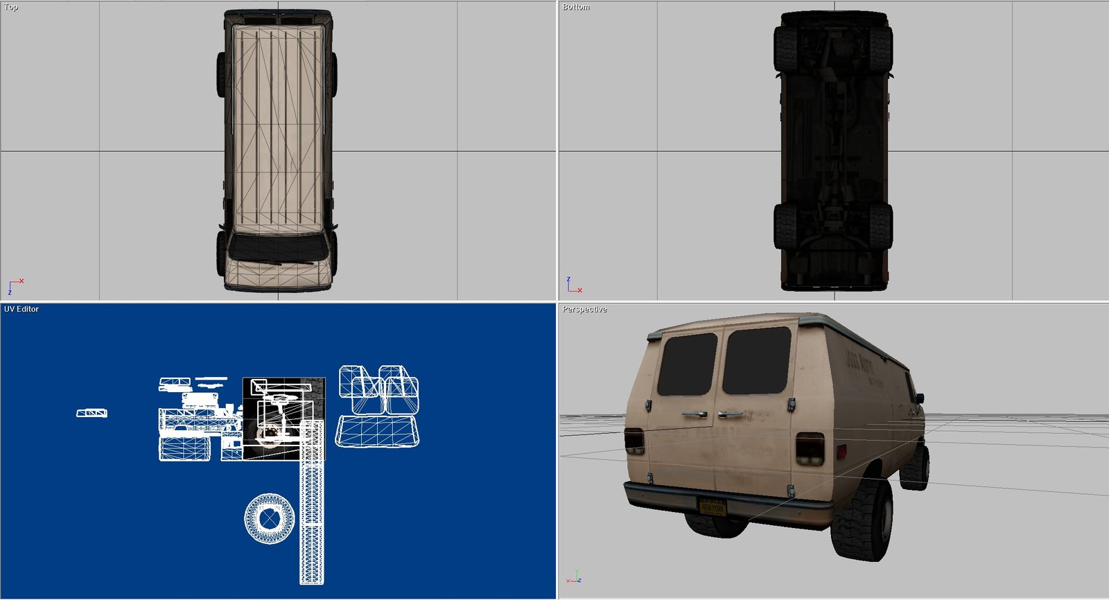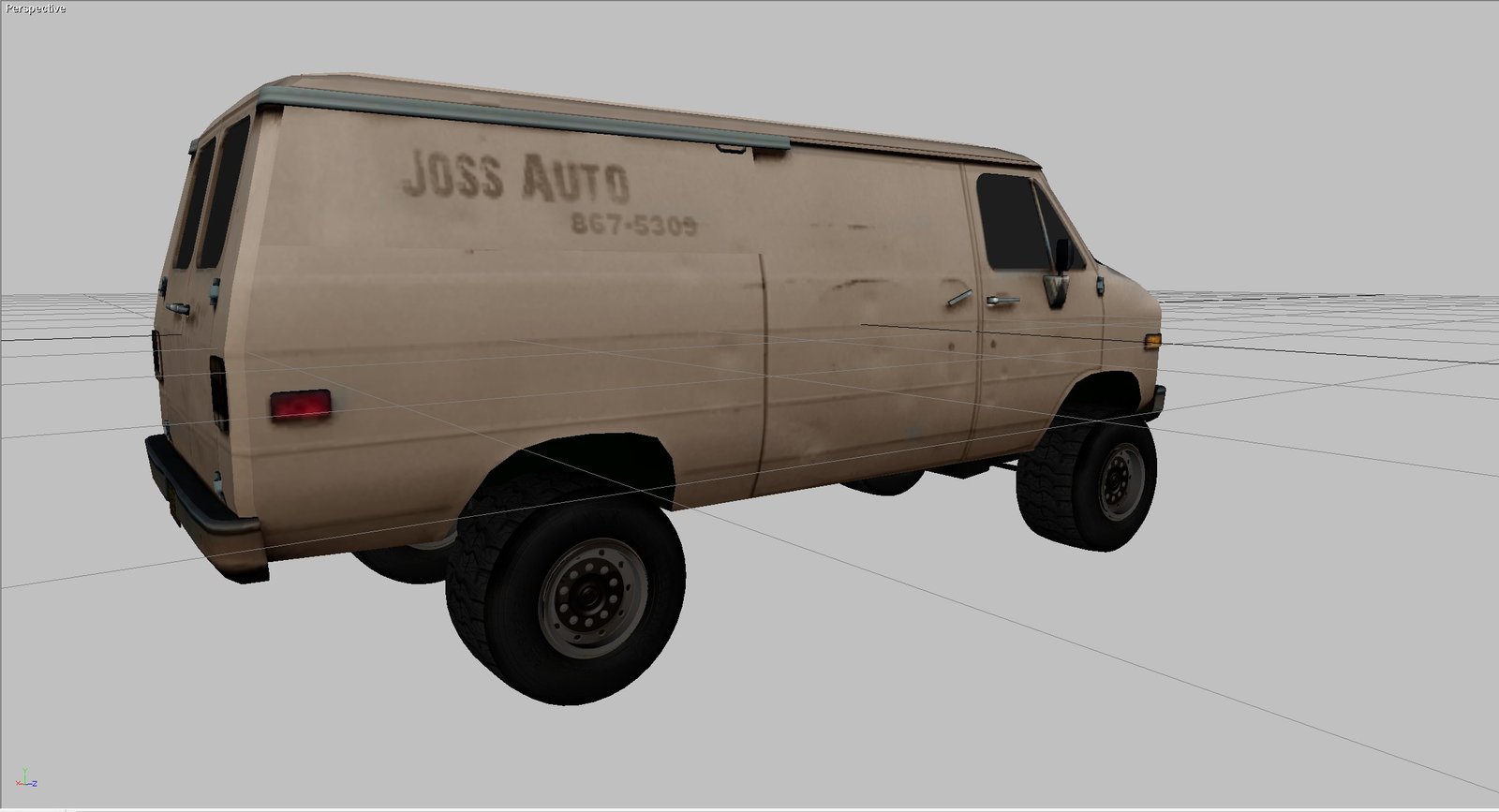 This is a beater van. I never used it after I realized it was teaching me a lot about UV work, not so much about 3D modeling. This is a 1 ton Chevy work van in rough shape.