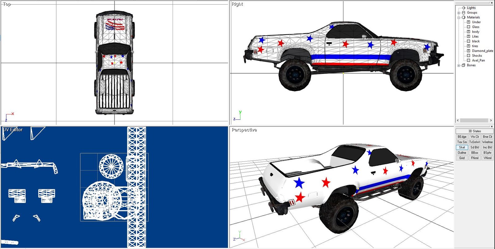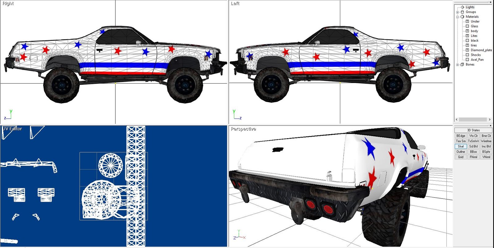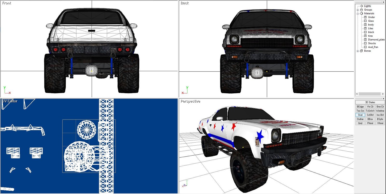 I liked the way the stock El Camino looked but I wanted to build a model that combined the El Camino bodylines and features I liked. I also wanted to build custom diamond plate and tube bumpers for it. The 3D model has a Chevy S10 frame @ 117 inches, the El Camino body needed 116. The frame was sectioned just as it would have to be and the arches relocated, at the same time I lost that inch. It surprised me how faithfully it recreated itself as I worked with, first building the model and then grafting in the S10 frame and full-size axels from a full-size chevy truck along with leaf spring suspension front and rear. The tires are 33-1450, larger and taller than the example.
